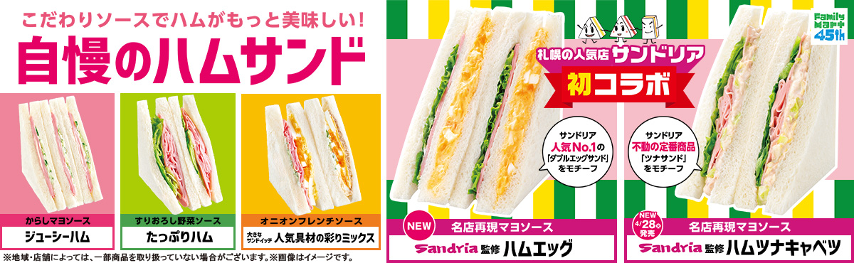 ファミマ初コラボ!札幌で人気が絶えない 手作りサンドイッチ専門店「サンドリア」監修商品が登場! 不動の人気 No.1 商品を再現したサンドイッチなど 「自慢のハムサンド」5 種類を 4 月 21 日(火)から順次発売!